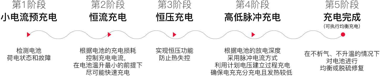 擁有充電曲線技術專利,五階段智能充電,快速高效穩(wěn)定