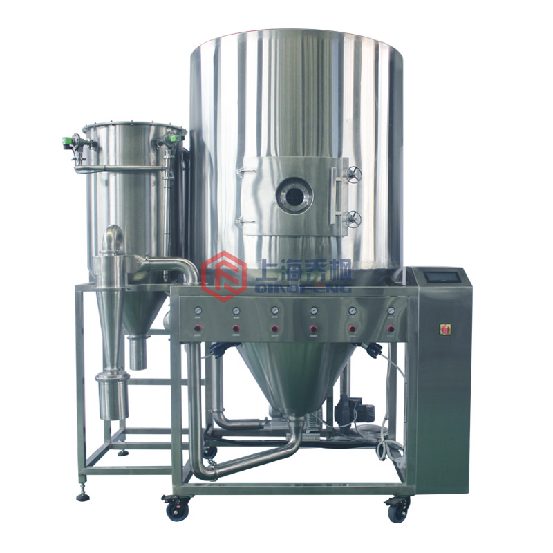 噴霧干燥器使處理溶液、懸浮液或泥漿狀物料的干燥設備,基本流程為料液通過霧化器,形成霧滴分散在熱氣流中。空氣經鼓風機送入空氣加熱器預熱,然后進入噴霧干燥器,與霧滴接觸干燥。產品中一部分落入塔底與氣體分離,另一部分由引風機吸入旋風分離器 經分離后將尾氣排空。 氣流式噴霧干燥機因使用氣流式霧化器而得名。氣流式霧化器的工作原理是利用高速氣流使液膜產生分裂。高速氣流采用壓縮空氣。料液的流速很低,當壓縮空氣以很高的環隙速度從霧化器噴出時,兩者存在很大的速度差,使氣液之間產生摩擦力和剪切力。液體 在瞬間被拉成一條條細長的絲,這些液絲在較細處很快斷裂而形成微小的霧滴。 離心噴霧干燥機主要是利用旋轉霧化器高速旋轉力將霧滴甩出,同樣是經熱風干燥后成為粉末或者顆粒。而本款噴霧干燥機是離心與氣流兩用型,當實驗需求粉末那采用氣流式,氣流式使用壽命長,不易損壞,同時這也是離心霧化器的缺點,當實驗需求均勻粉末或者顆粒時選離心霧化系統噴霧干燥。