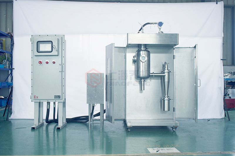 制藥專用 防爆級小型閉式噴霧干燥機,裝置特別針對于有機溶劑,以使用循環氮氣而形成的惰性氣體介質取代通常的空氣介質,來進行噴霧干燥。除了能回收產品之外,尚可回收有機溶劑。針對有機溶劑低閃點或者微毒的特點,易燃易爆的特點特別設計該套閉式循環噴霧系統。