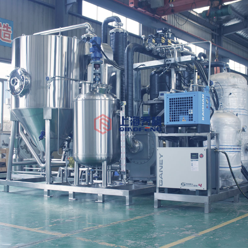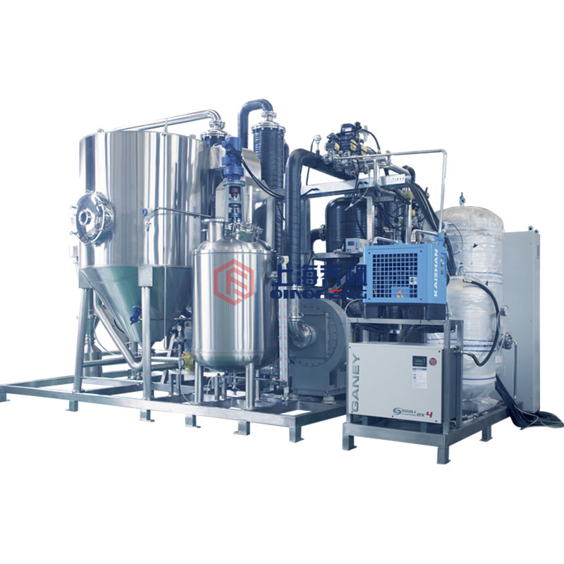 設備主要由:送料系統、加熱系統、霧化系統、噴霧干燥系統、惰性氣體循環系統、產品回收系統、冷凝系統組成。